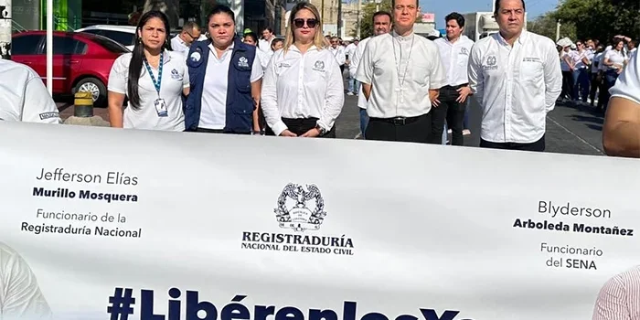 En Santa Marta, funcionarios de la Registraduría Nacional participaron en la marcha convocada por el Sena para alzar la voz en señal de rechazo por el secuestro del delegado departamental del Chocó, Jefferson Murillo y el funcionario Blyderson Arboleda del Sena.