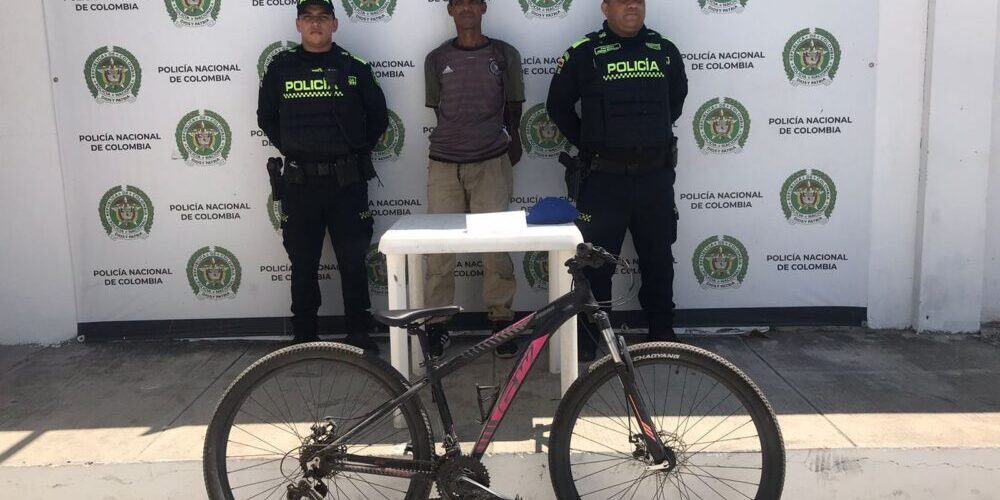 La Policía Metropolitana de Santa Marta logro la captura en flagrancia de Willian Junior Morales Soto 40 años de edad, por el delito de hurto, luego que la patrulla de vigilancia adscrita al CAI del Mercado recibiera información por parte de una ciudadana quien manifestó que momentos antes había sido víctima de hurto, por parte de un hombre de sexo masculino que mediante forcejeo la obligo a entregarle su bicicleta y huyo hacia el barrio San Martin, inmediatamente se iniciaron las labores de búsqueda e indagación sobre el sector, recibiendo información de la ciudadanía que la bicicleta se la había hurtado un hombre que vestía jeans de color beige y suéter negro de contextura delgada y de tes morena, mediante las labores de búsqueda se logra observar a un hombre con las mismas características aportadas por la víctima y la ciudadanía, esta persona llevaba una bicicleta, al verificarla era la misma de la víctima, se leyeron los derechos como persona capturada por el delito de hurto, dejándolo a disposición de la autoridad competente