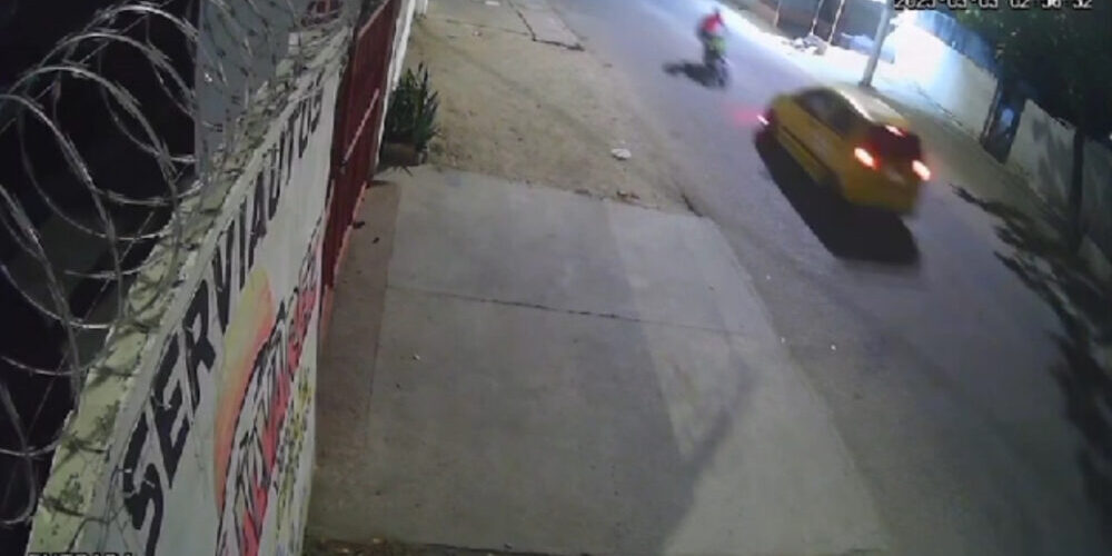 Un fuerte accidente de tránsito quedó registrado en una cámara de seguridad, mostrando el momento en que un motociclista que se desplazaba a alta velocidad impactó de frente contra un taxi en una vía de Santa Marta.