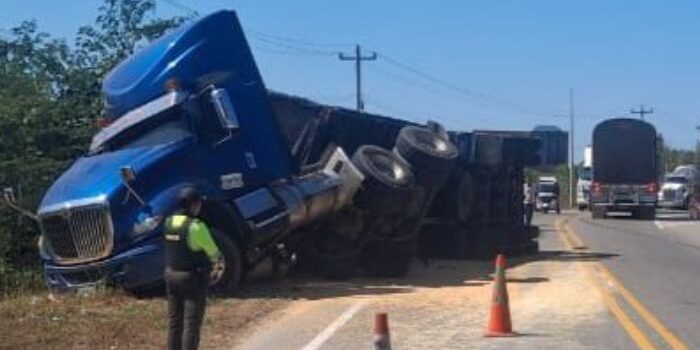 Un accidente de tránsito se registró en la Troncal de Oriente, en el tramo que comunica la Ye de Ciénaga con Río Ariguaní, luego de que un tractocamión cargado de maíz terminara volcado a un costado de la carretera. El hecho fue atendido por unidades de la Seccional de Tránsito y Transporte del Magdalena.